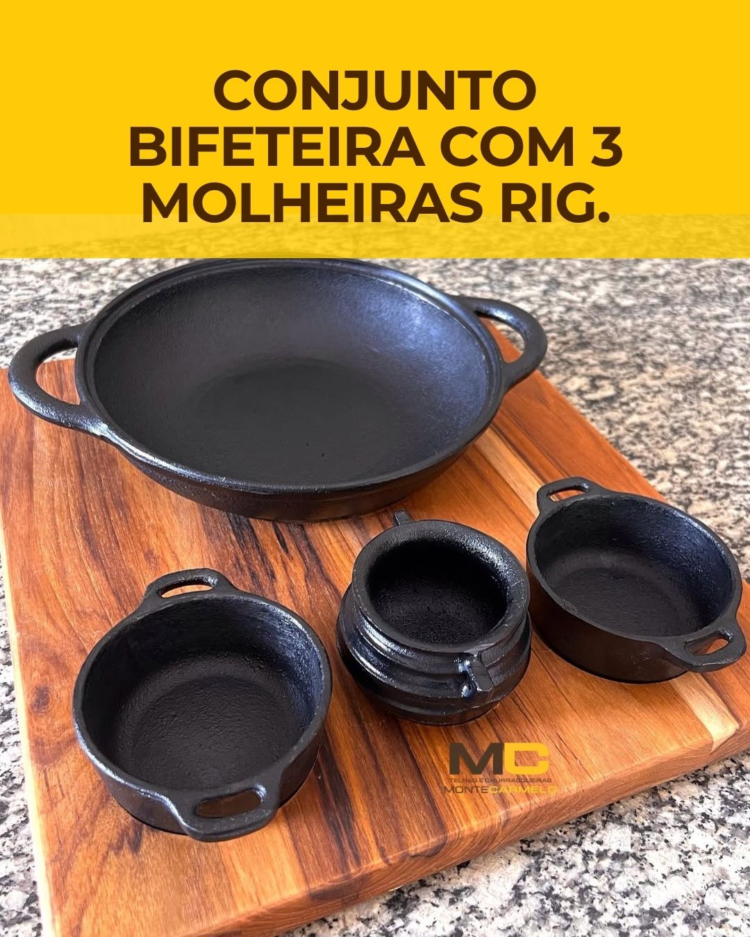 A bifeteira de ferro fundido de alta qualidade acompanha 3 molheiras e ainda conta com o suporte de madeira para servir comida quente e fresca, tem uma boa apresentação, além de ser resistente, bonita e manter-se aquecida por muito tempo.